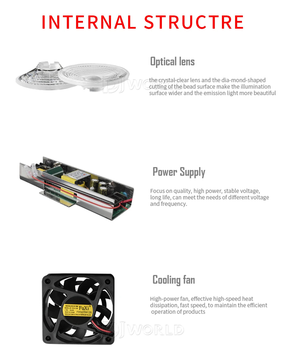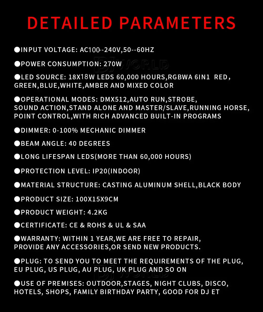 - Uitgerust met 18 x 18W RGBWA + UV LED's, biedt deze lamp een breed scala aan kleuren en effecten. Of u nu levendige kleuren of subtiele tinten wilt creëren, deze lamp levert altijd de gewenste sfeer.
