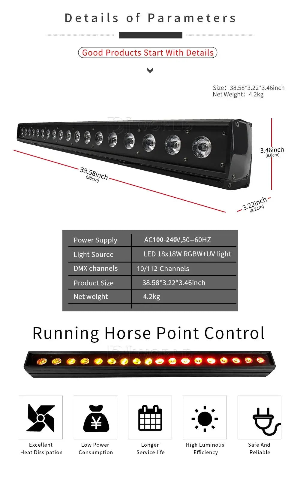Productbeschrijving: Indrukwekkende 18x18W (324W) LED-Wash Wall Lamp RGBWA + UV 6IN1 DMX Ledbalk met Blacklight Functie