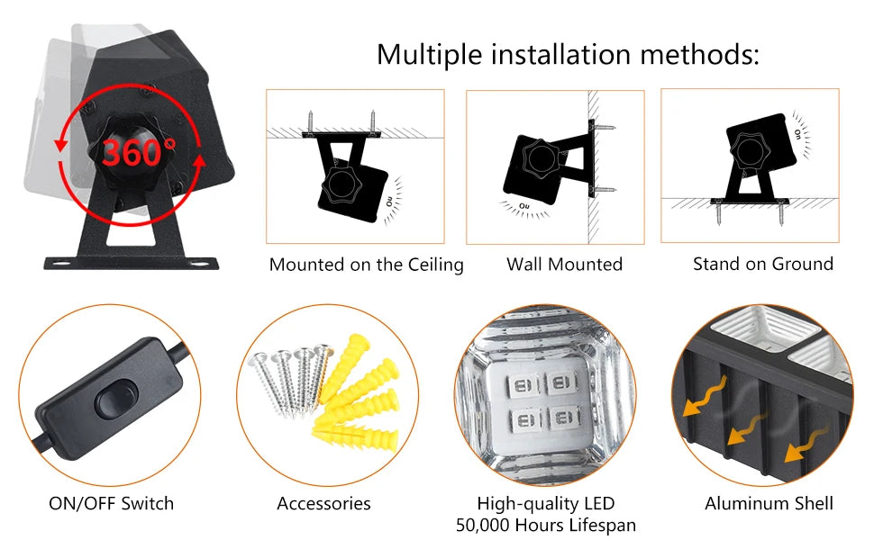 Eenvoudige Installatie: Werkt op 100-240V, wordt geleverd met een schakelaar, stekker en een kabel van 139,7 cm. Geen bedrading nodig, plug-and-play installatie.