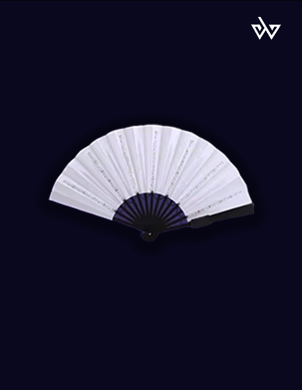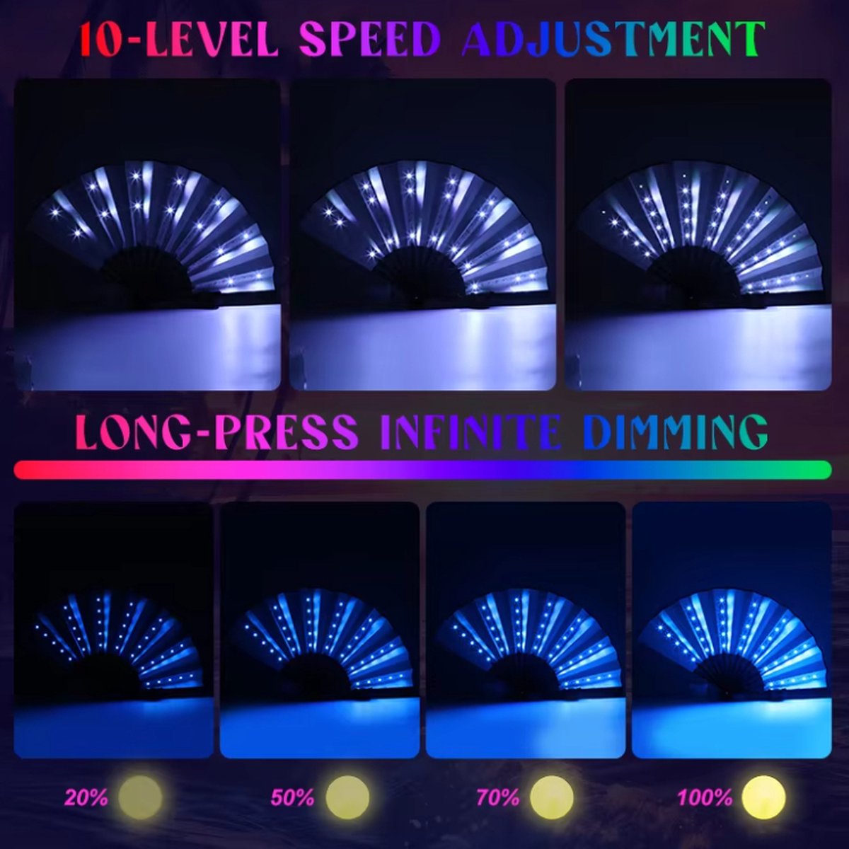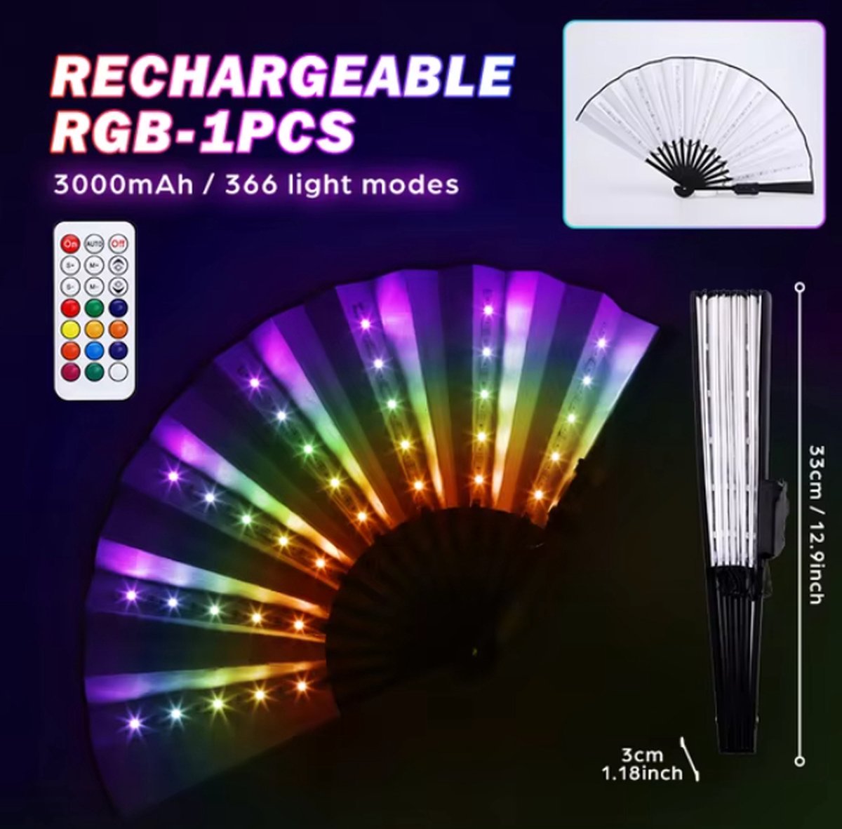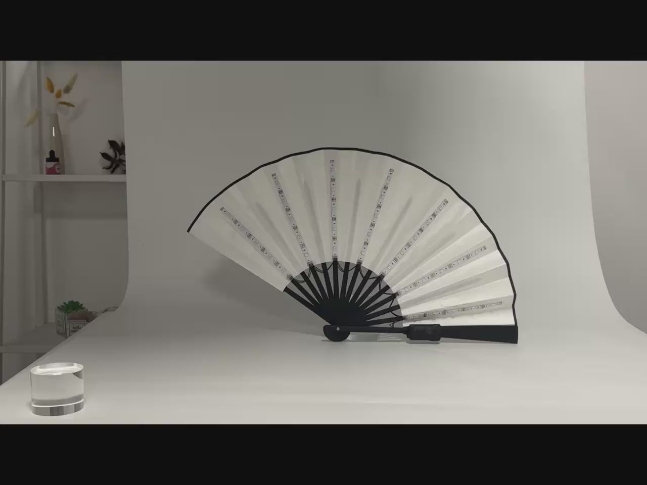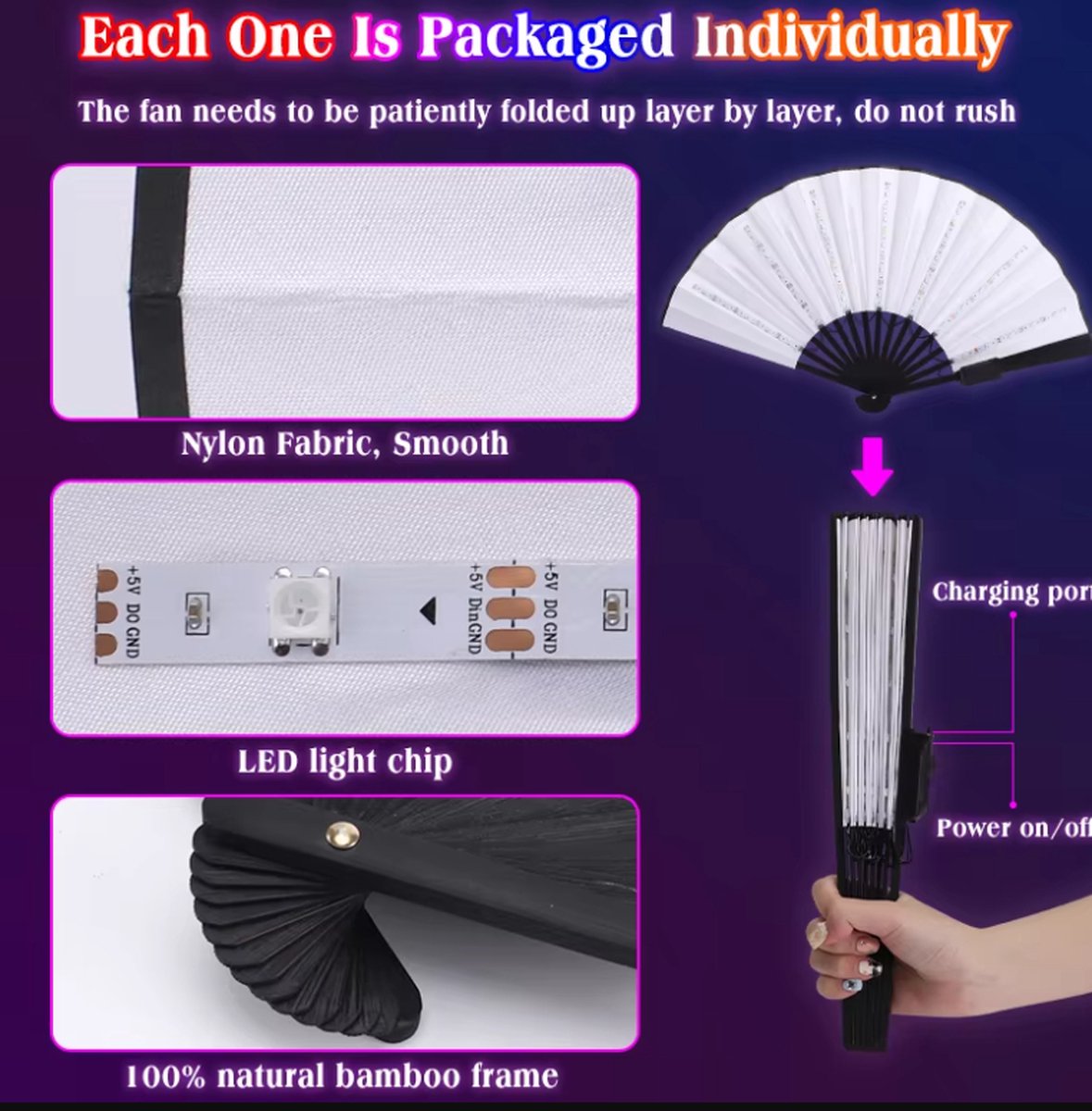 Productbeschrijving bamboe/zijden RGB-ventilator met verschillende functies en specificaties.