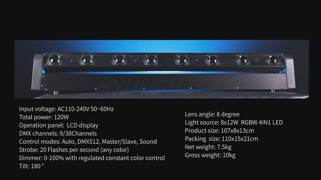De 8x12W Full Color LED Beam Moving Head Bar is een veelzijdige en krachtige moving head met 8 RGBW lampen die elk afzonderlijk licht kunnen geven wat zorgt voor een gave lichtshow. Met zijn effecten en automatische standen biedt deze moving head bar indrukwekkende visuele en betrouwbare prestaties.
