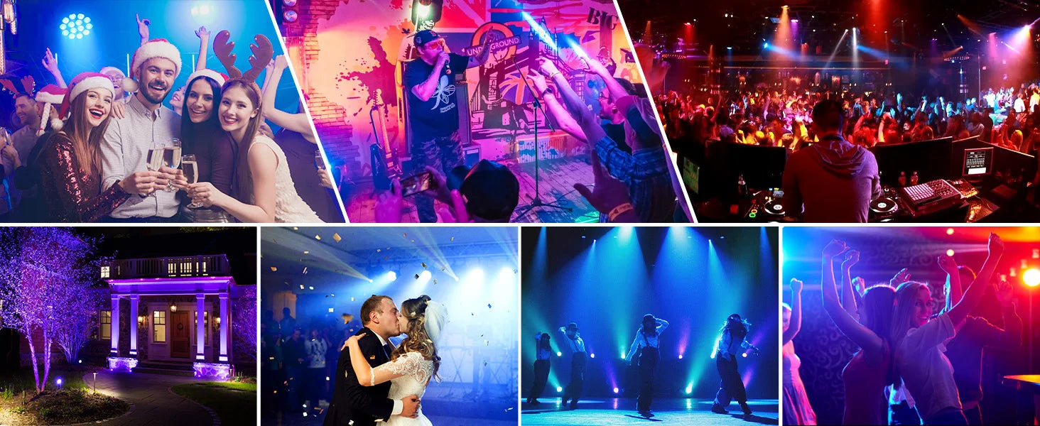 - De podiumlichten zijn uitgerust met 6 verschillende modi die eenvoudig kunnen worden aangepast aan uw behoeften: APP-besturing, gemengde kleuren, automatische stand, geluid geactiveerd, song audio, en zelf samengestelde scene met gesynchroniseerde kleur. Deze standen zorgen ervoor dat u altijd de perfecte sfeer kunt creëren, ongeacht de gelegenheid.